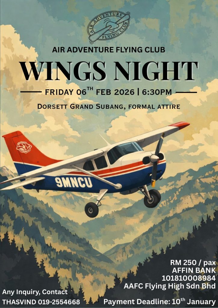 Our Annual wing night will be held on the 6th of February 18:30 at the Dorset Grand Hotel ( ball room ) in Subang. For last minute bookings and ticket sales, please contact our finance Ms. Naemah at +60164968581 or Captain Thasvind at +60192554668